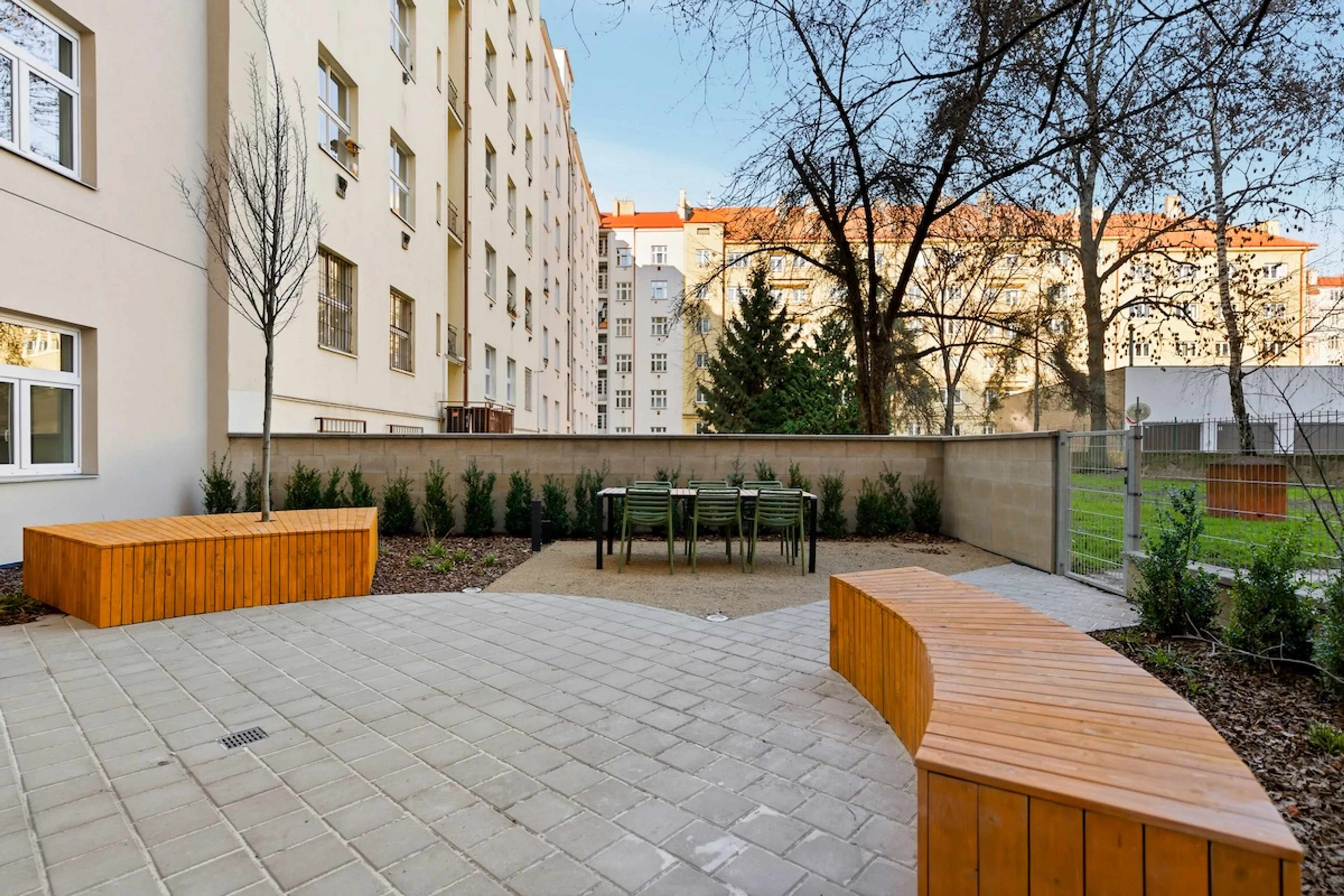 V projektu Pecháčkova 6 jsme stavěli na charakteru domu. Zachované terrazzo na podlahách doplňují noblesní benátské štuky, vstupní prostory a chodby osvětlují elegantní lampy z broušeného skla. Výrazným prvkem jsou nové kazetové dvoukřídlé dveře v petrolejové barvě. Kompletní obnovou prošlo schodiště a zábradlí, instalovali jsme nové designové schránky, skryté elektrické rozvody, nové stoupačky i sklepní kóje Troax. Součástí projektu je také připravovaná relaxační zahrada ve vnitrobloku s wellness, saunou a klidovou zónou pro obyvatele.